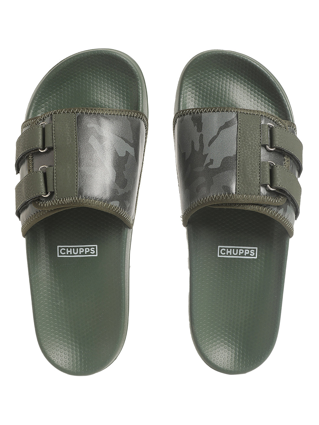 - A pair of ranger comfort men's sliders with green military print uppers featuring a convenient velcro system for a customizable fit gives you cushioned footbed and slip-resistant sole that provide all-day comfort, making them perfect for any outdoor activity.